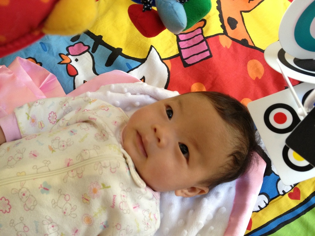 Oct 22 Searching for meaning… Zoe tries to decipher what the bright colors and bold line drawings of her Wimmer-Ferguson Infant Stim-Mobile from Uncle Alfred are trying to tell her. 37.735351-122.249555